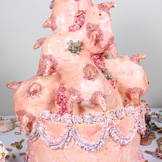 In this solo exhibition at the Saskatchewan Craft Council Gallery, Manitoba artist Julianna Zwierciadlowska-Rhymer presents a striking installation of ceramic desserts, fibre tapestries, and self-portrait photographs. At first, her pastel cake-like ceramic sculptures appear luxurious and inviting. However, a closer look reveals unsettling and sometimes grotesque details designed to prompt reflection and discomfort.