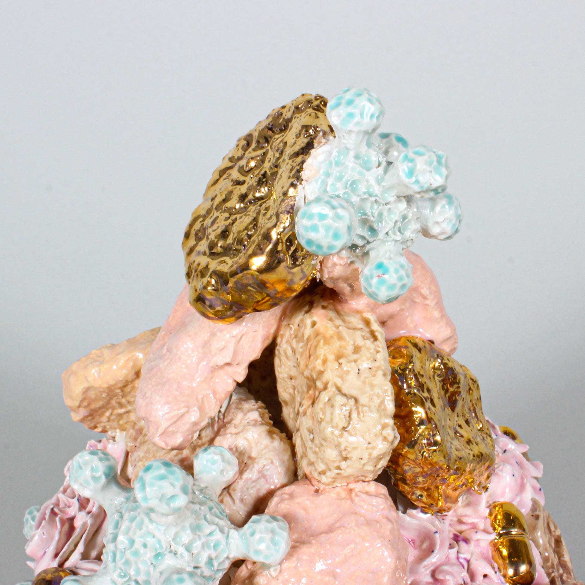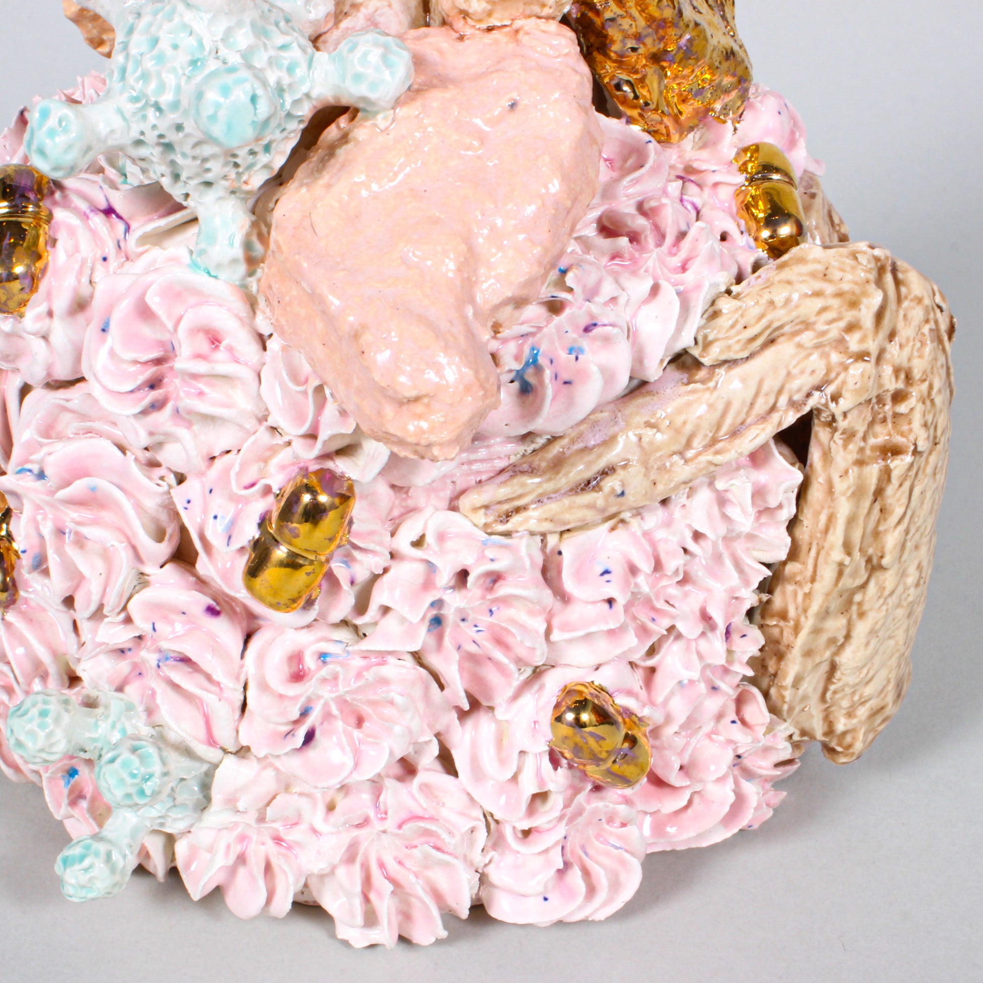 Ceramic cake, low fire, electric fired with gold lustre; wheel thrown, hand built, slipcast