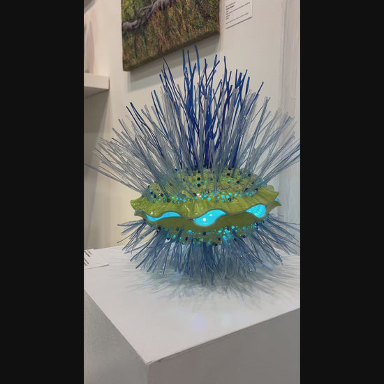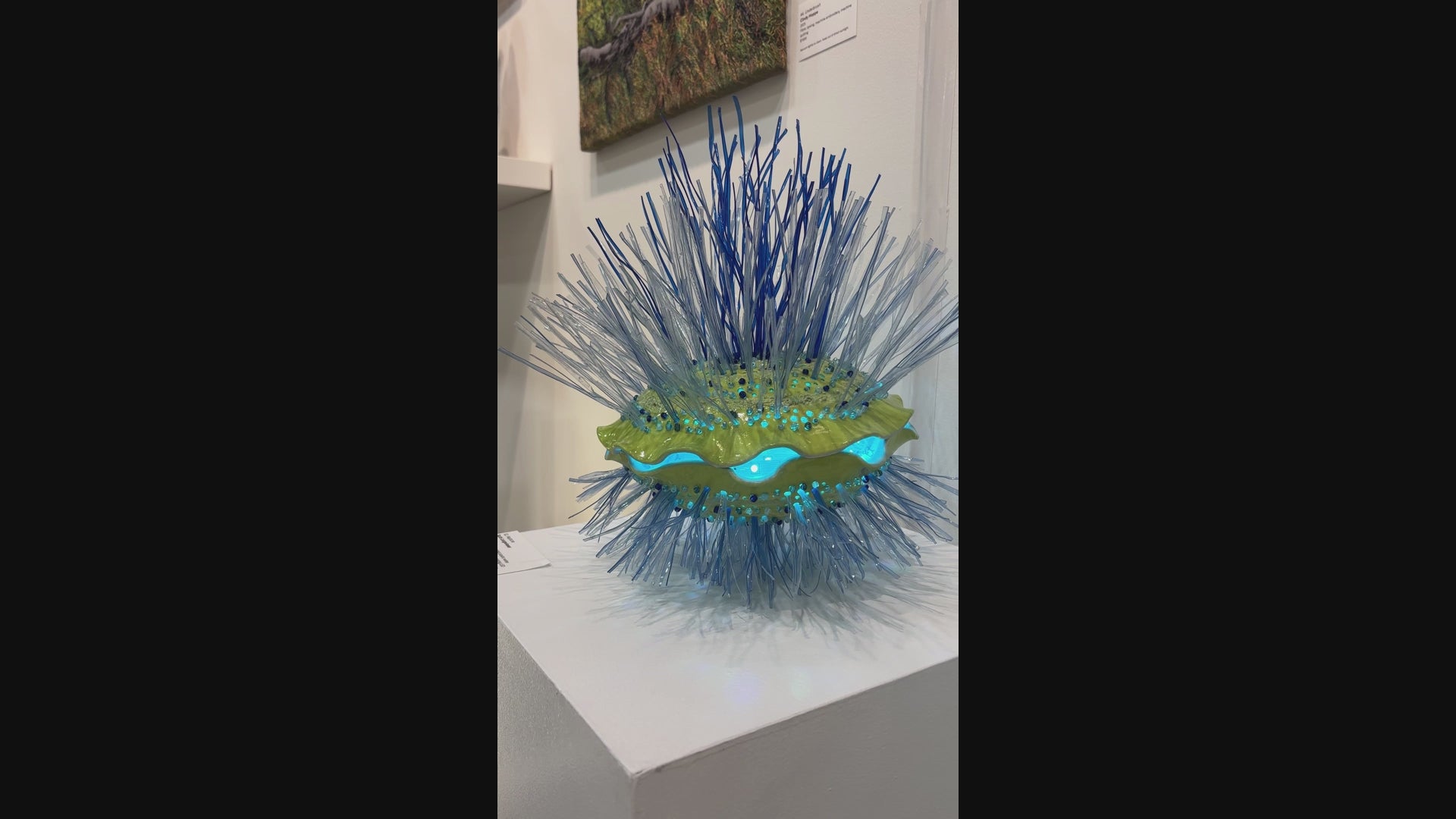 Stoneware clay, recycled plastic water bottles, glass beads, colour changing LED strip (removable); wheel throwing, scraffito, beading