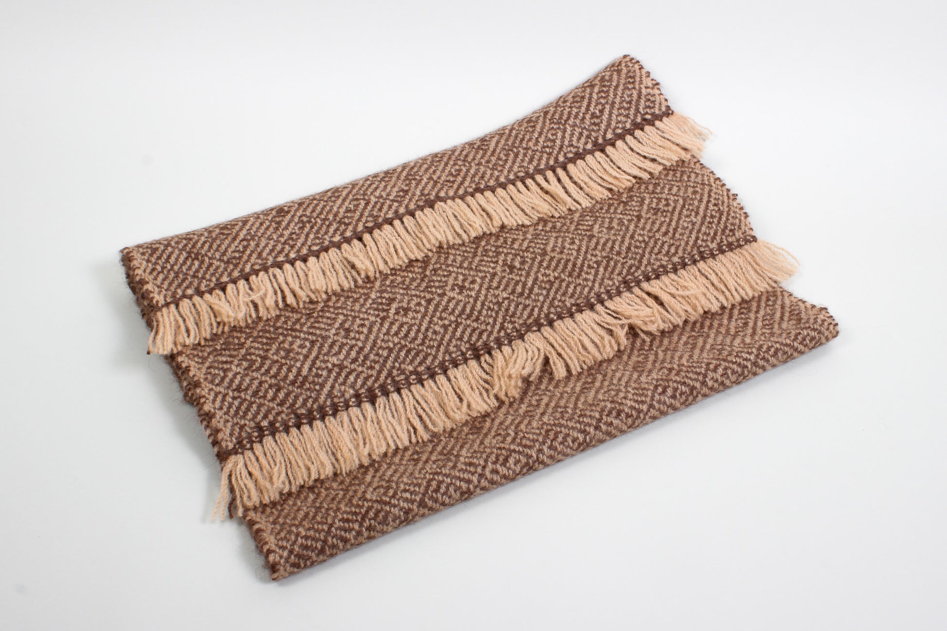 Llama and merino blend yarn (Annette Neustaedter and Ron Srhmil), Clun Forest and Dorset sheep blend Superfine Wool (Loch Lomond Wool Products), birch bark and hawthorn bark dye; weaving, dyeing