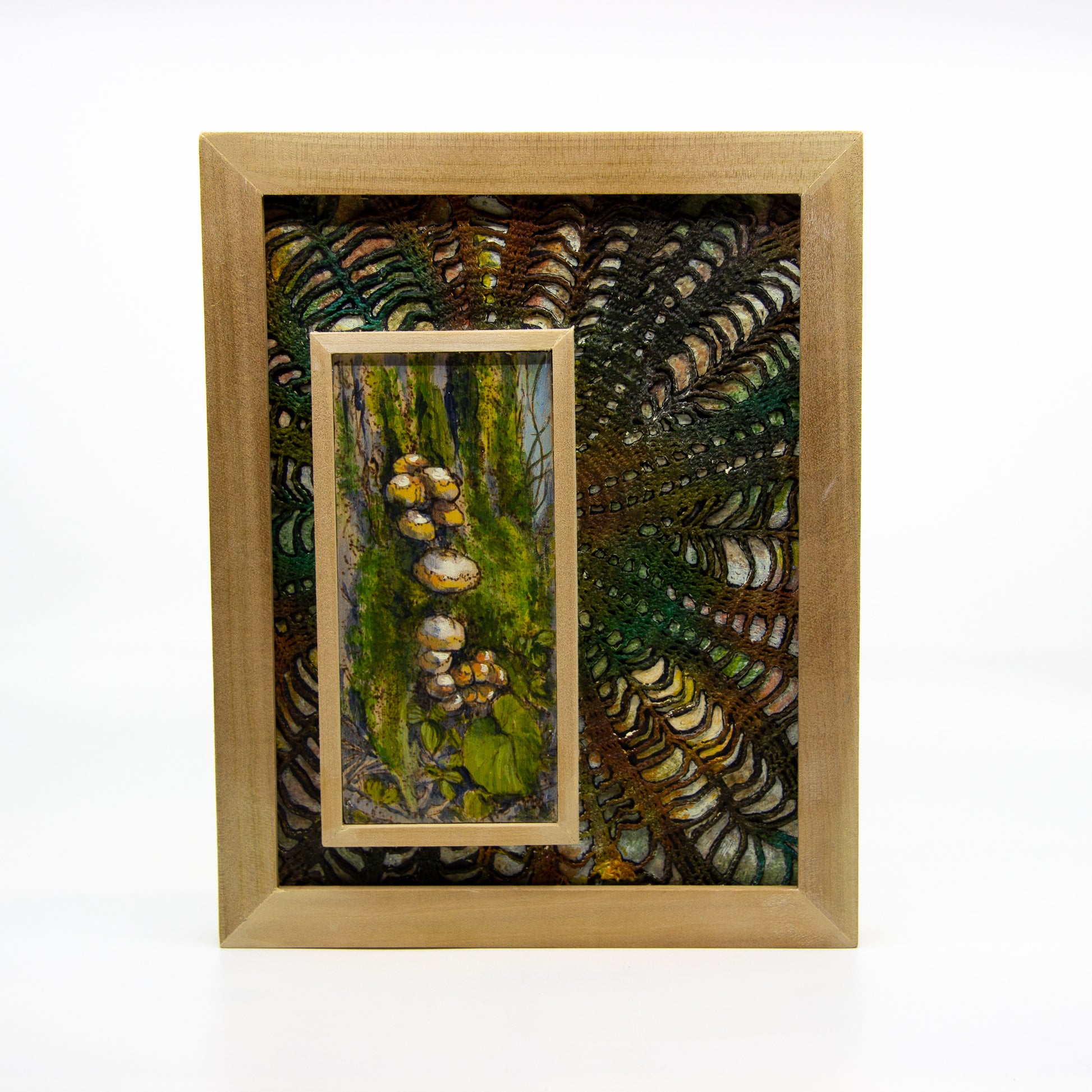 Wood panel, acrylic paint, yarn; Pyrography, acrylic stains, hand dyed crochet