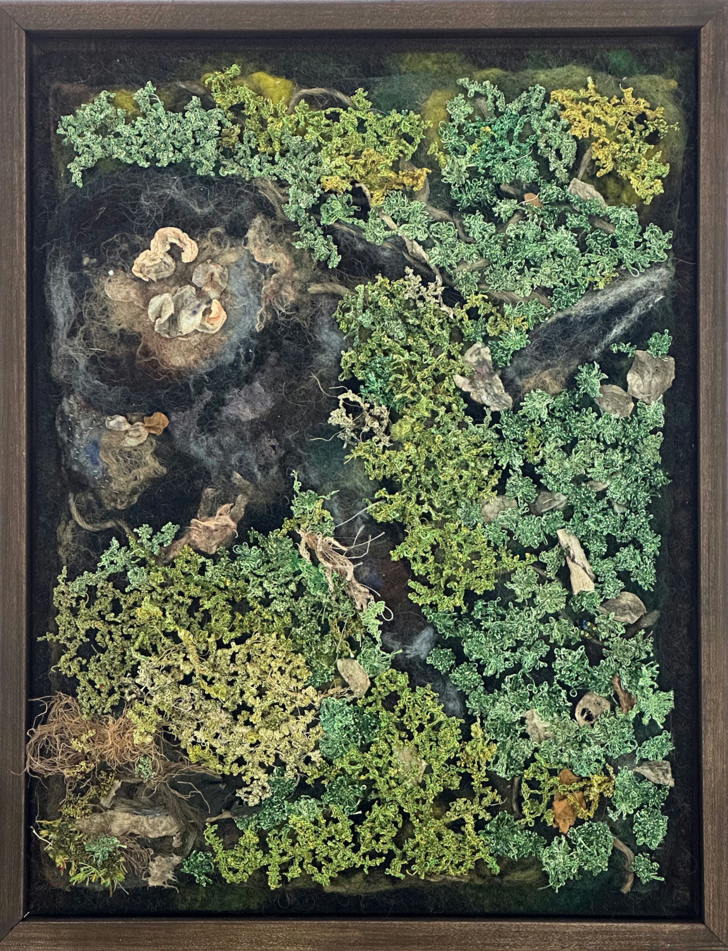 Wool; wet-felted, free motion stitched, thread painted, maple frame