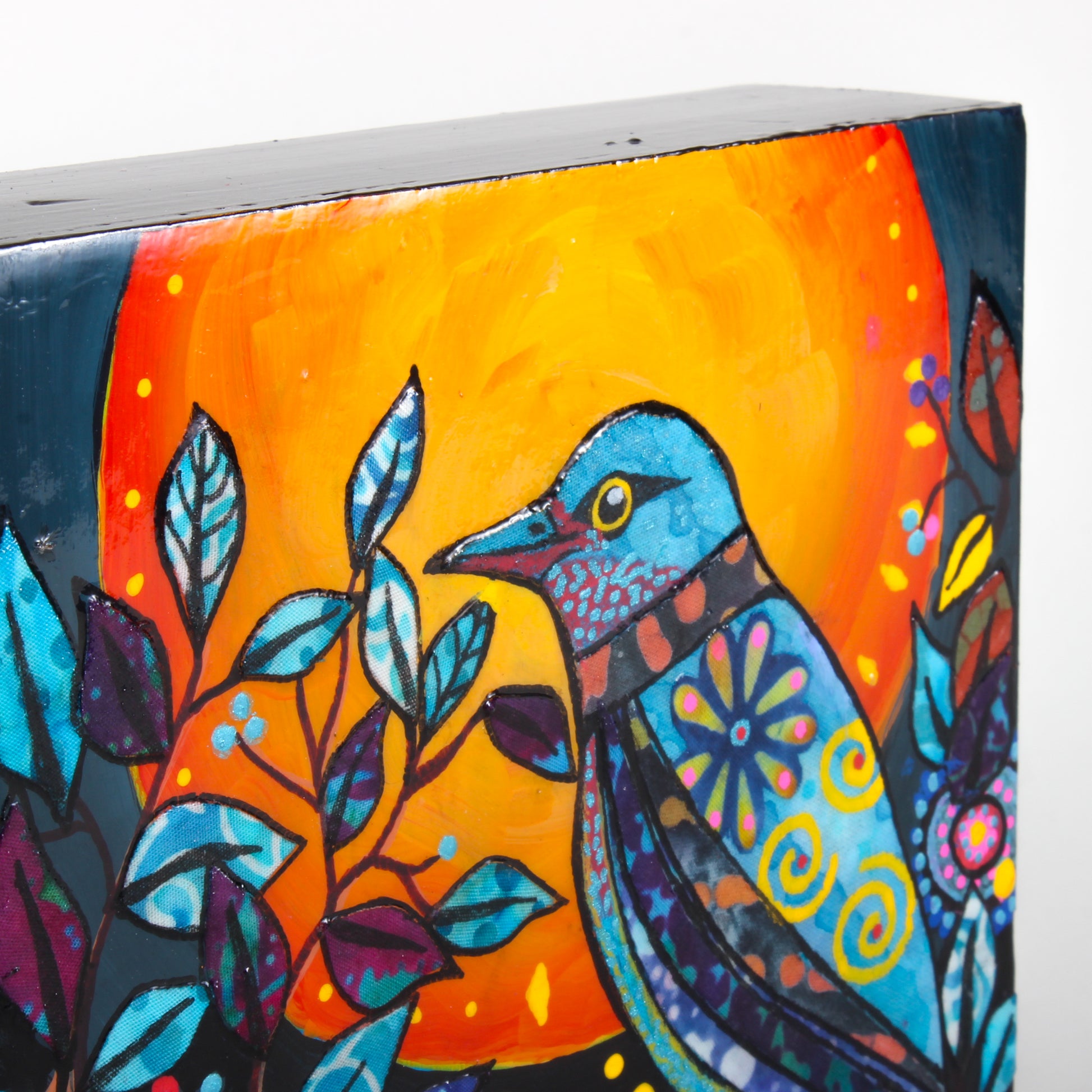 Mixed Media; Fabric & acrylic in on wood panel. Hanging wire on back.