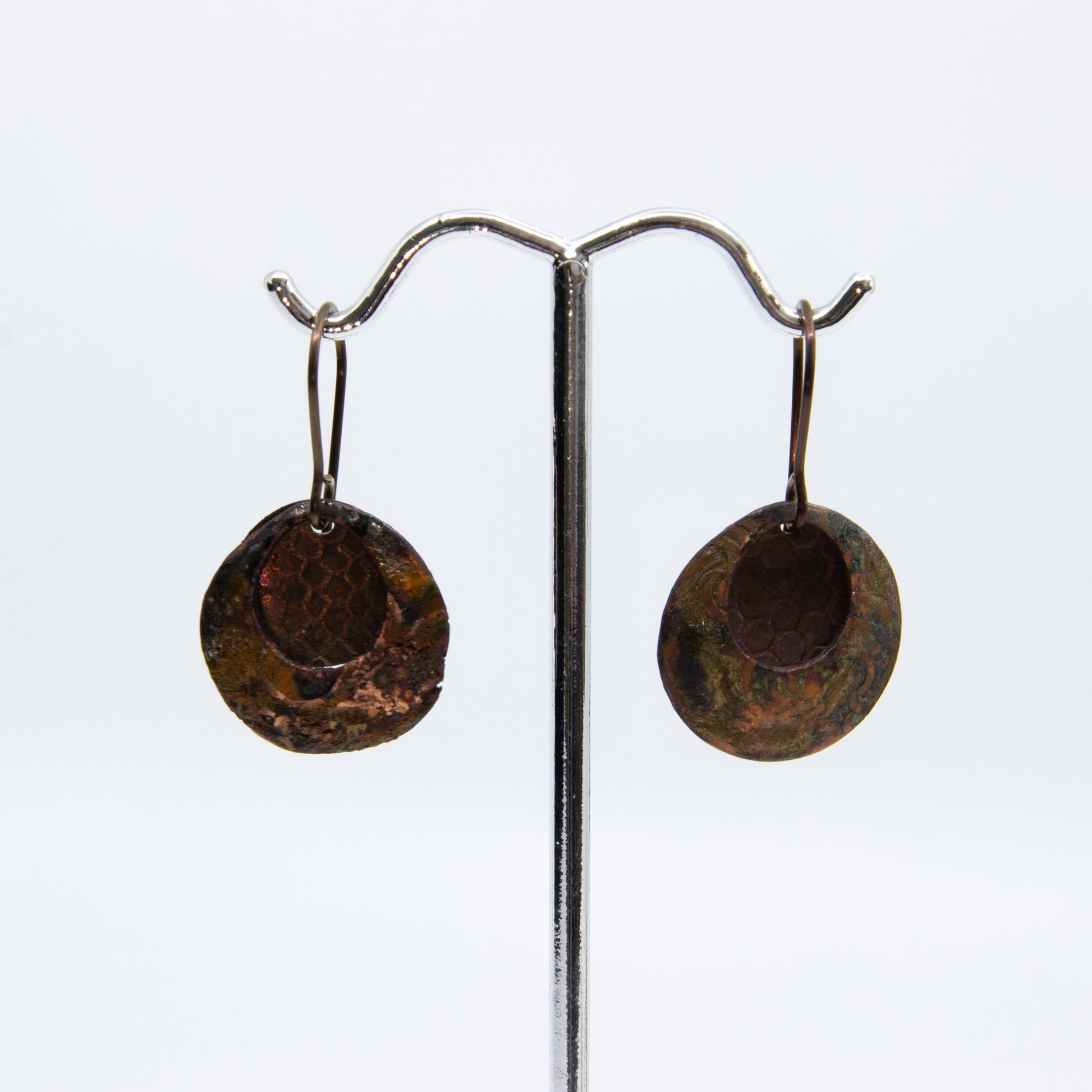 Layered Copper Circles: Copper, titanium wire; 3.1 x 1.6 x 0.3 cm