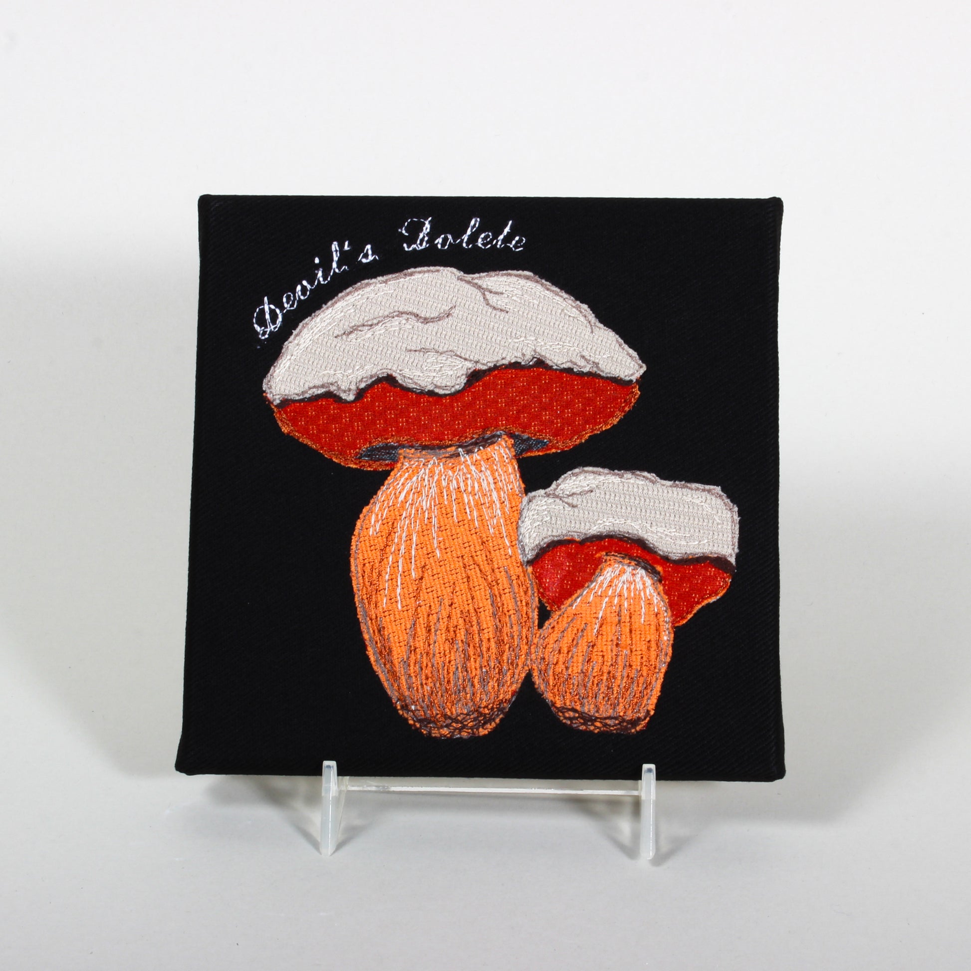 Repurposed material, which is then thread painted with details onto black fabric and stretched over a wooden frame