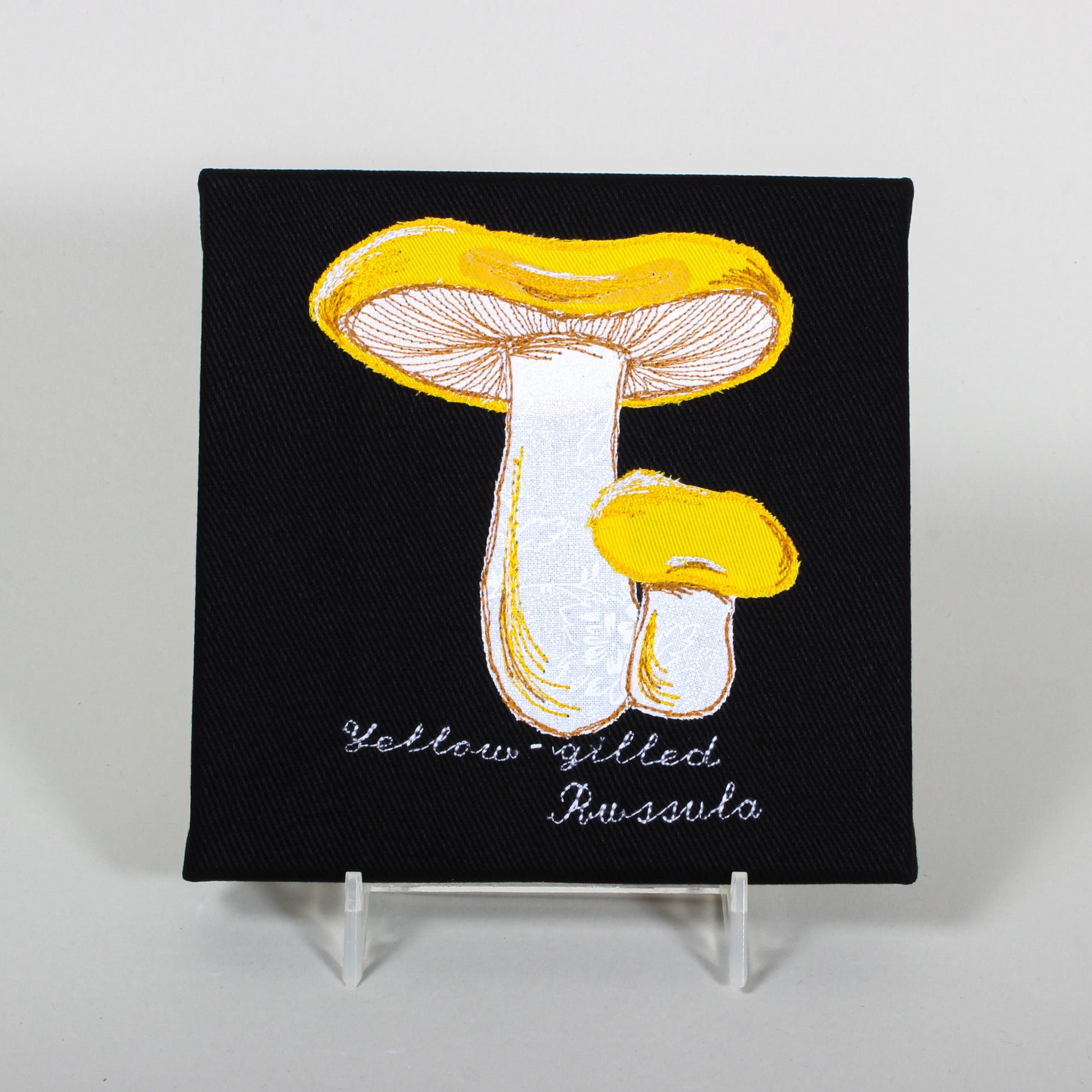 Repurposed material, which is then thread painted with details onto black fabric and stretched over a wooden frame